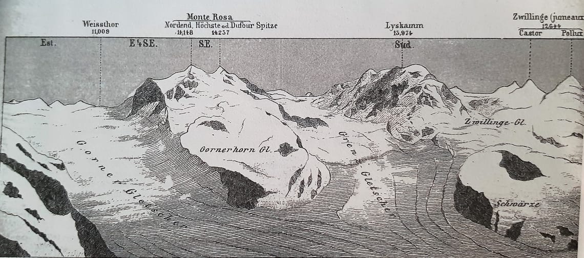 Fündig wurde er in einer Walliser Landkarte von 1682. Im Jubiläumsbuch hielt er fest: «Bis Mitte des 19. Jahrhunderts ist die Kulmhöhe übrigens nicht als Gornergrat sondern gelegentlich auch als Riffelgrat oder Rothgrat, der Monte Rosa jedoch als Gornerhorn bezeichnet worden». Auf der um 1682 in Brig entstandenen Walliser Karte des Landschreibers Antoni Lambien fand er weder das Gornerhorn noch den Riffel. Auf dieser Karte wurde das Monte Rosa-Gebiet noch als Findelhorn, aber sein Gletschersee bereits als Gornersee bezeichnet.