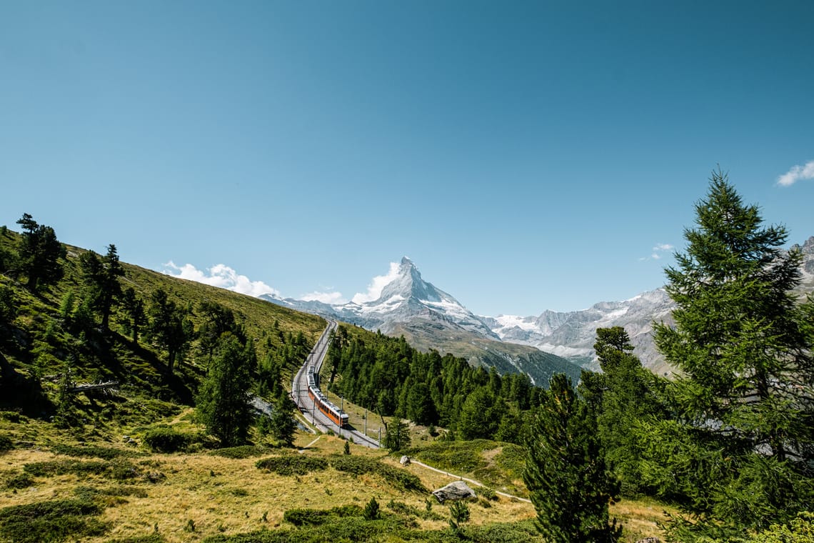 The Gornergrat Bahn in the panoramic curve above Riffelalp with a view of the Matterhorn